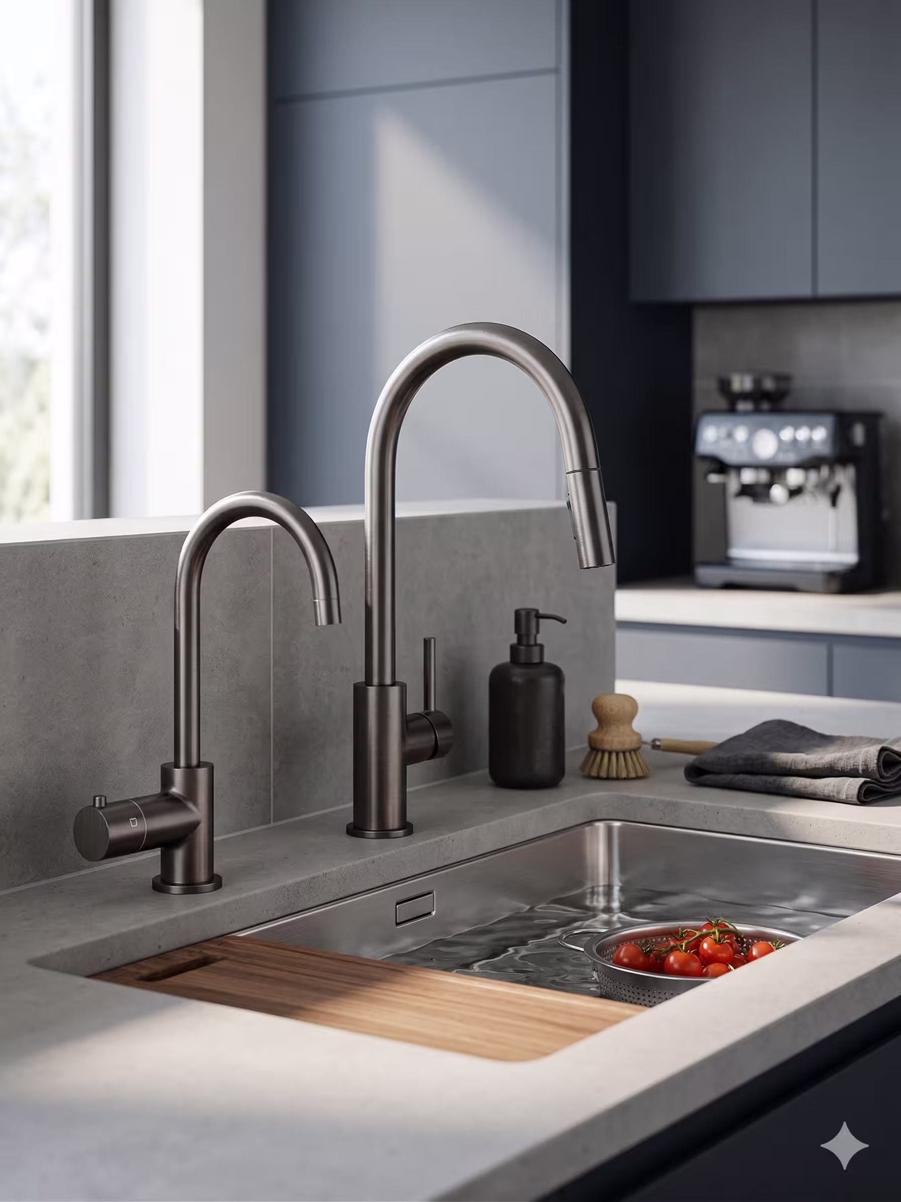 הכניסו למטבח שלכם את הטרנד הלוהט ביותר בעולם העיצוב. מערכת תת כיורית חם קר ברז גפריט היא השילוב המושלם בין מראה מודרני, כהה ומתוחכם לבין נוחות מוחלטת. המערכת המתקדמת של מי בראשית מפנה לכם את השיש, מעלימה את הקומקום והבקבוקים, ומשאירה בחוץ רק ברז סטיקים בגוון גפריט (גרפיט) יוקרתי. זהו פתרון אסתטי שמשדרג את נראות המטבח ומספק מים רותחים וקפואים בלחיצה קלה.