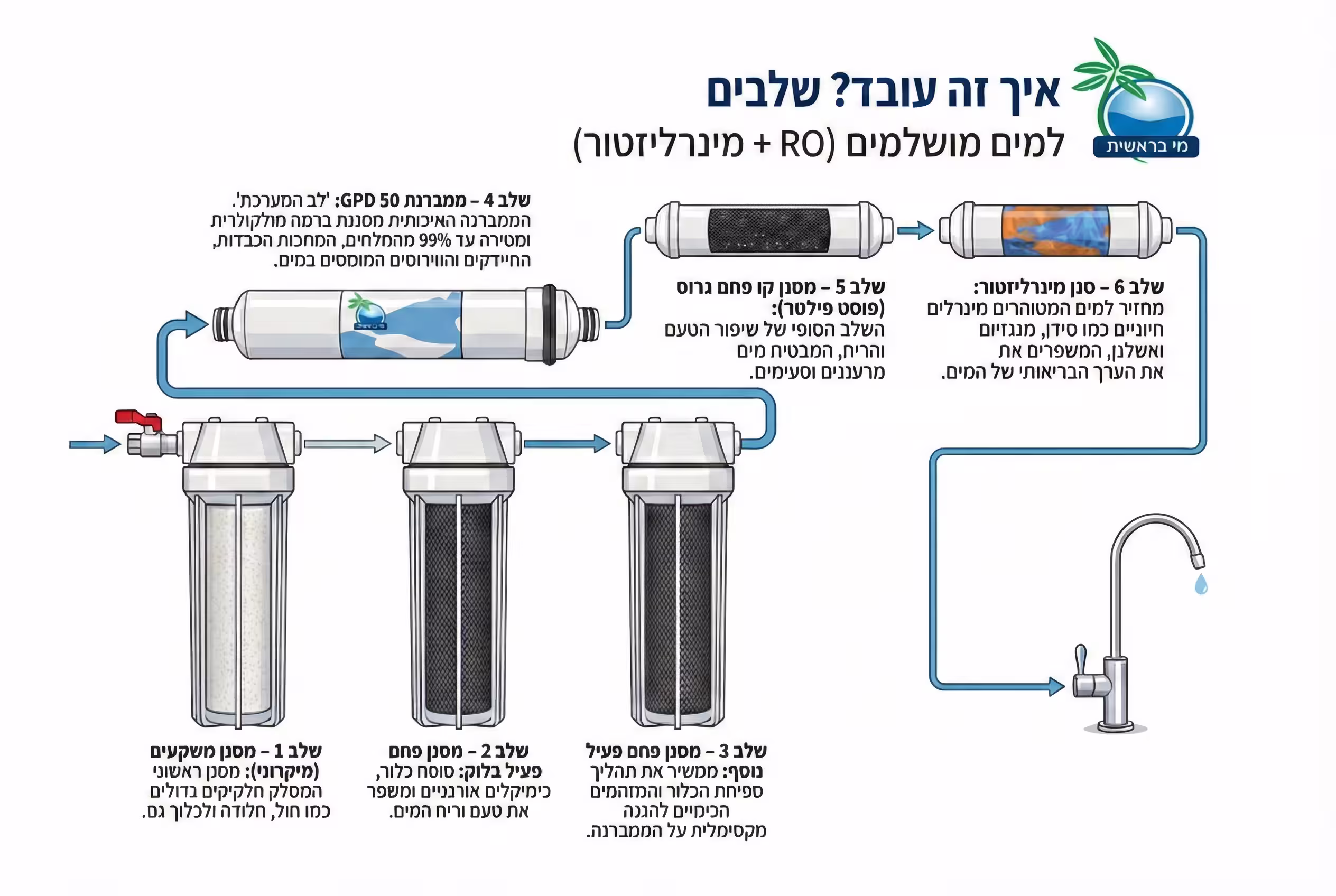 חשוב לדעת: רוב המערכות המודרניות כוללות שלב חמישי של "מינרליזטור" המחזיר למים מינרלים חיוניים (כמו סידן ומגנזיום) ומשפר את הטעם הסופי, כך שאתם נהנים ממים נקיים אך עשירים בערכים תזונתיים.