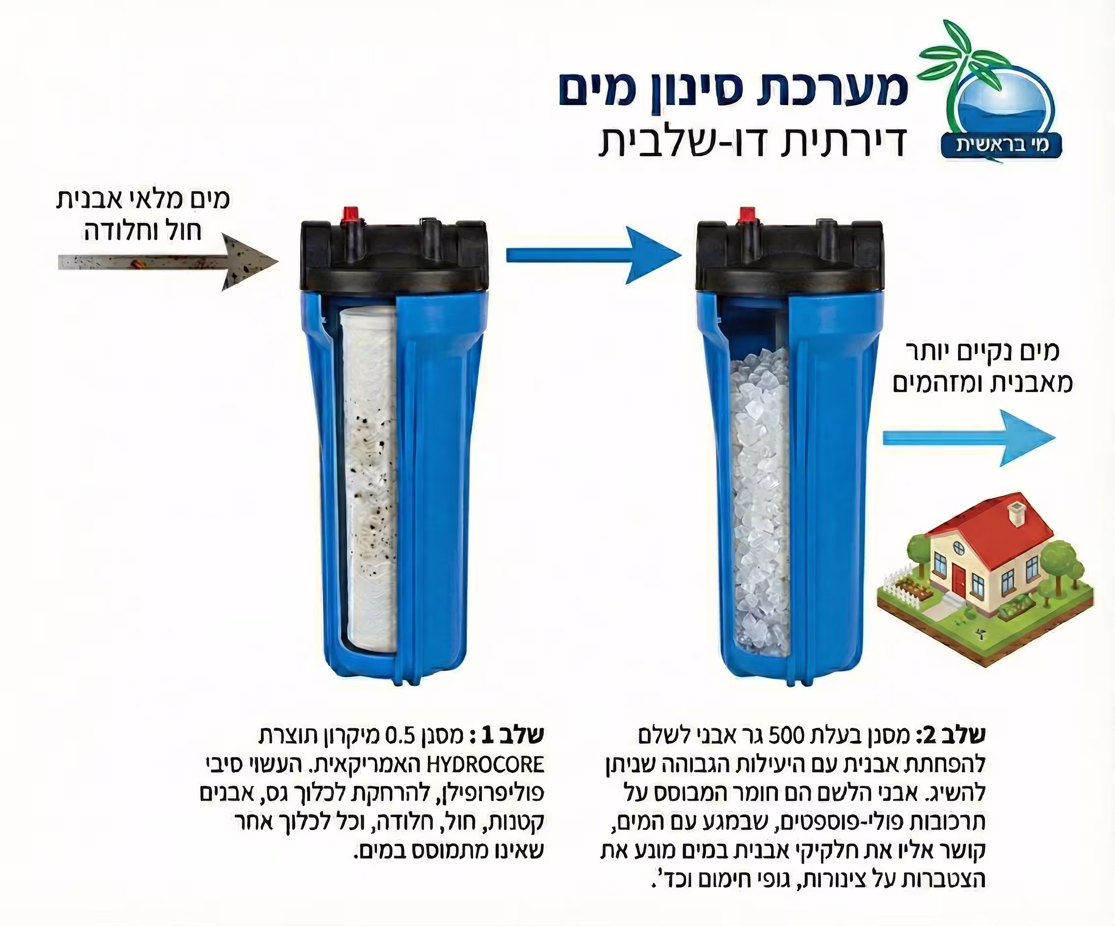 שלב 1: סינון משקעים (0.5 מיקרון) המים נכנסים לבית הסנן הראשון ועוברים דרך מסנן פוליפרופילן צפוף במיוחד של חברת HYDROCORE. המסנן פועל כ"רשת" שחוסמת פיזית מעבר של לכלוך גס, חול, חלודה ואבנים קטנות. רמת הסינון הגבוהה (0.5 מיקרון) עוצרת גם חלקיקים מיקרוסקופיים שאינם מומסים במים.